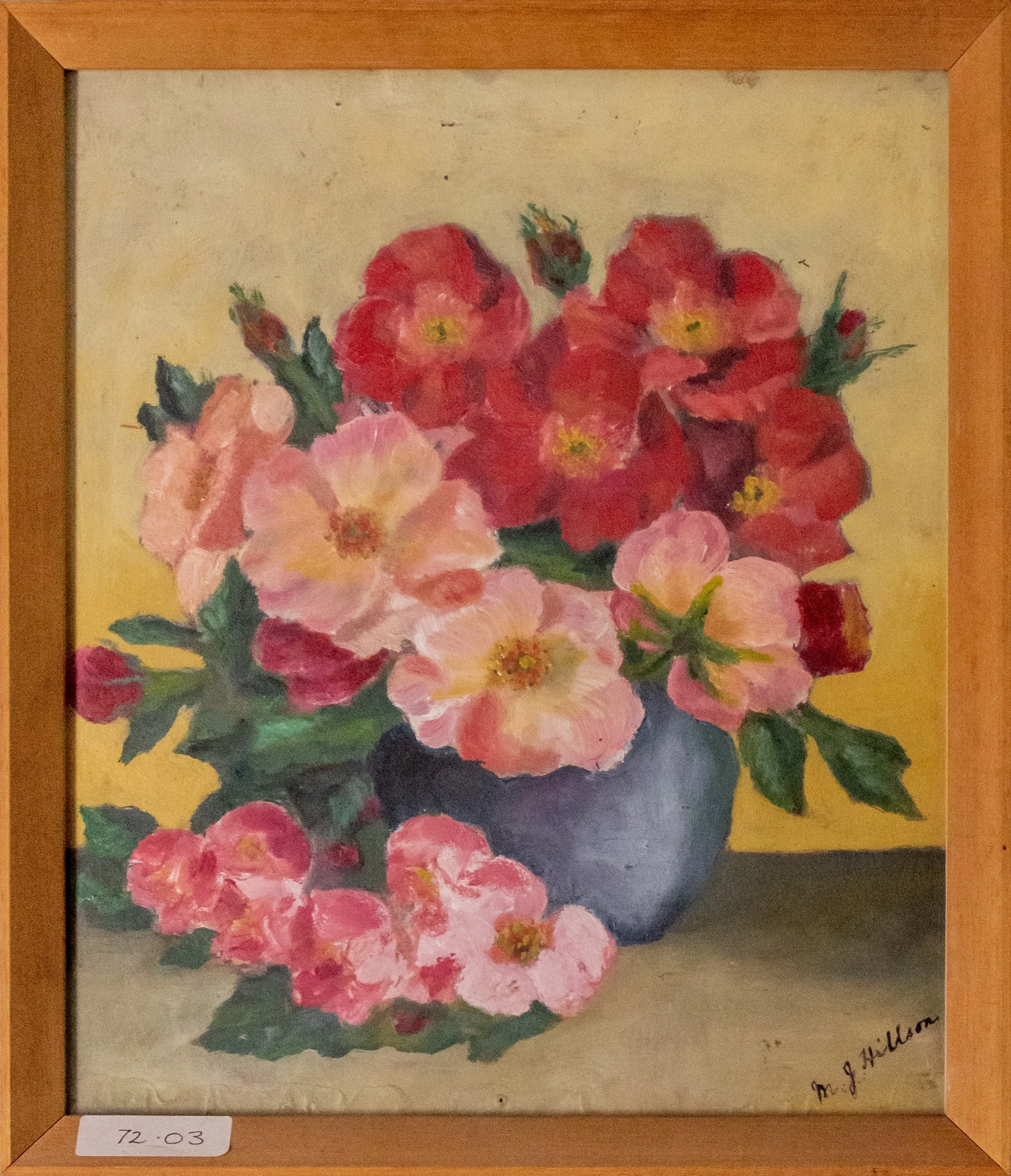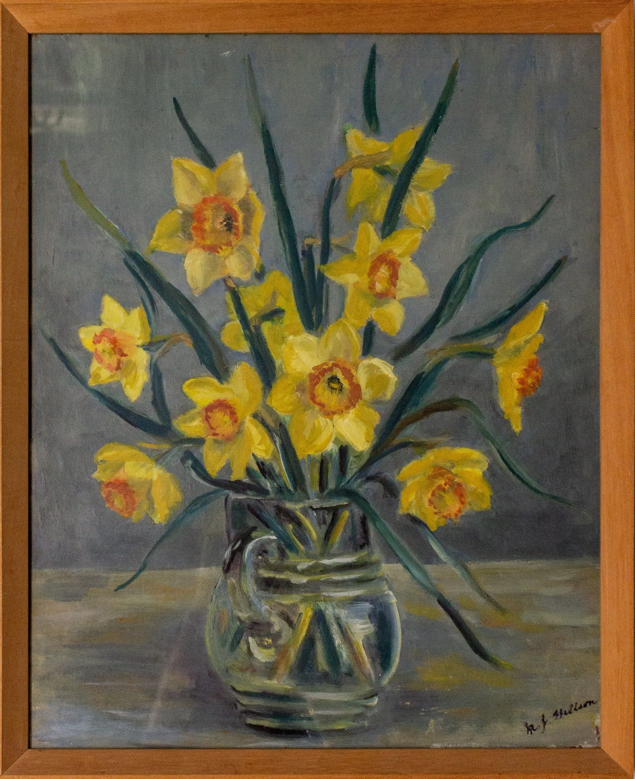 Mabel J Hillson lived and worked in Leamington Spa, and was 85 years old when we met her in 1972. (She lived on to the great age of 99). She was well known locally as a painter of still-life works, examples of which can be seen at the Leamington Art Gallery.