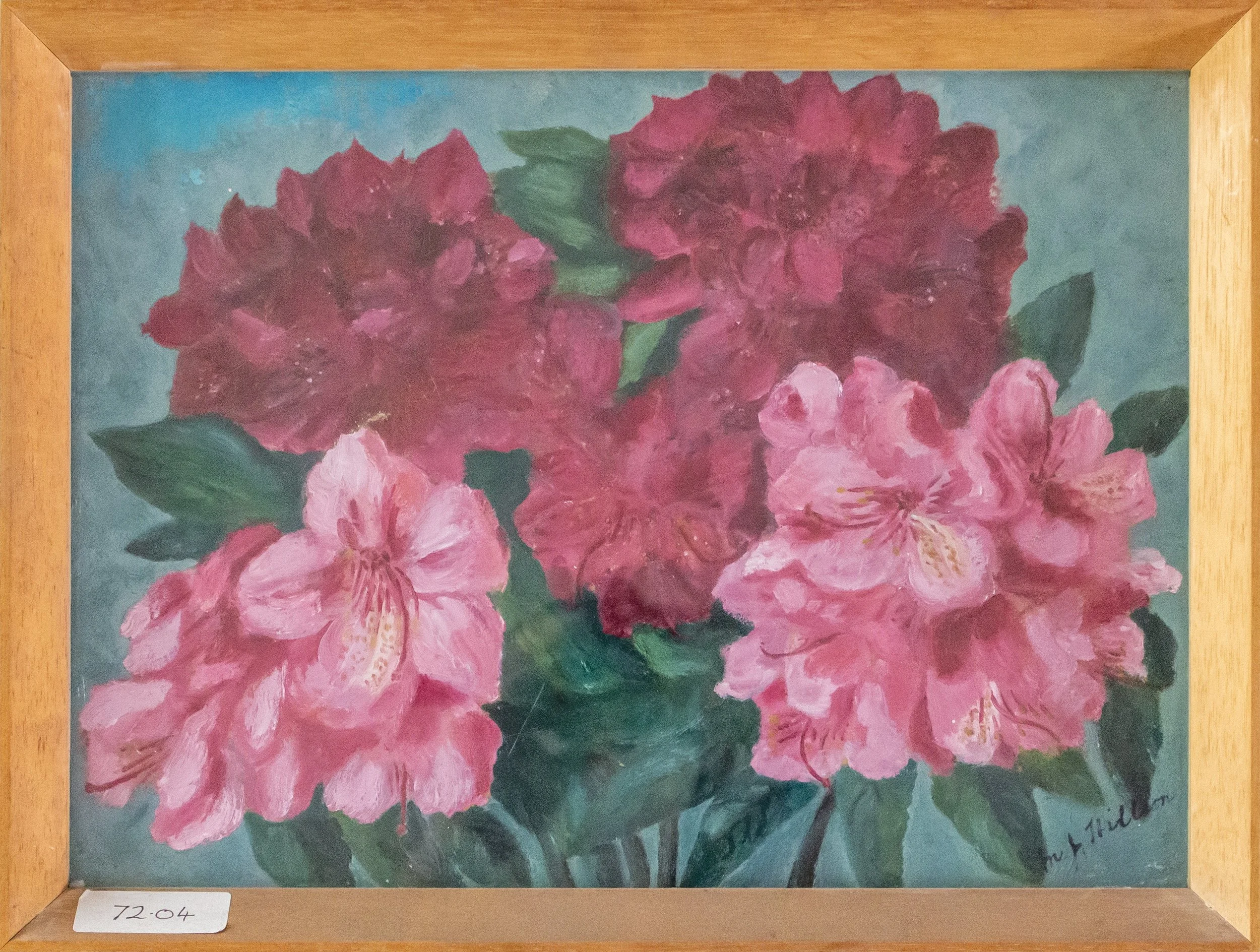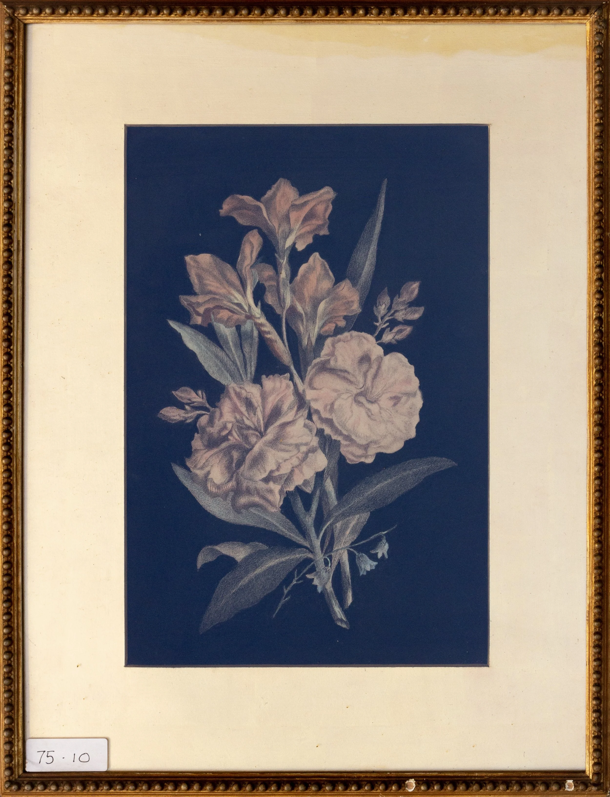 La habilidad del ilustrador botánico es ser capaz de crear un compromiso de precisión, una imagen idealizada de varios especímenes y la inclusión del anverso y el reverso de características tales como pétalos y hojas. Este ejemplo, comprado en el Warwick Antique Centre en 1975, se puede fechar con precisión por su marco (hecho por John H. Paris, Leece Street 15 y 17, Liverpool) hacia 1885. Las dos flores más grandes (según información obtenida a través de una app identificadora de plantas!) son Mathiola Incana, y los otros en el grupo son Nerium Oleander.