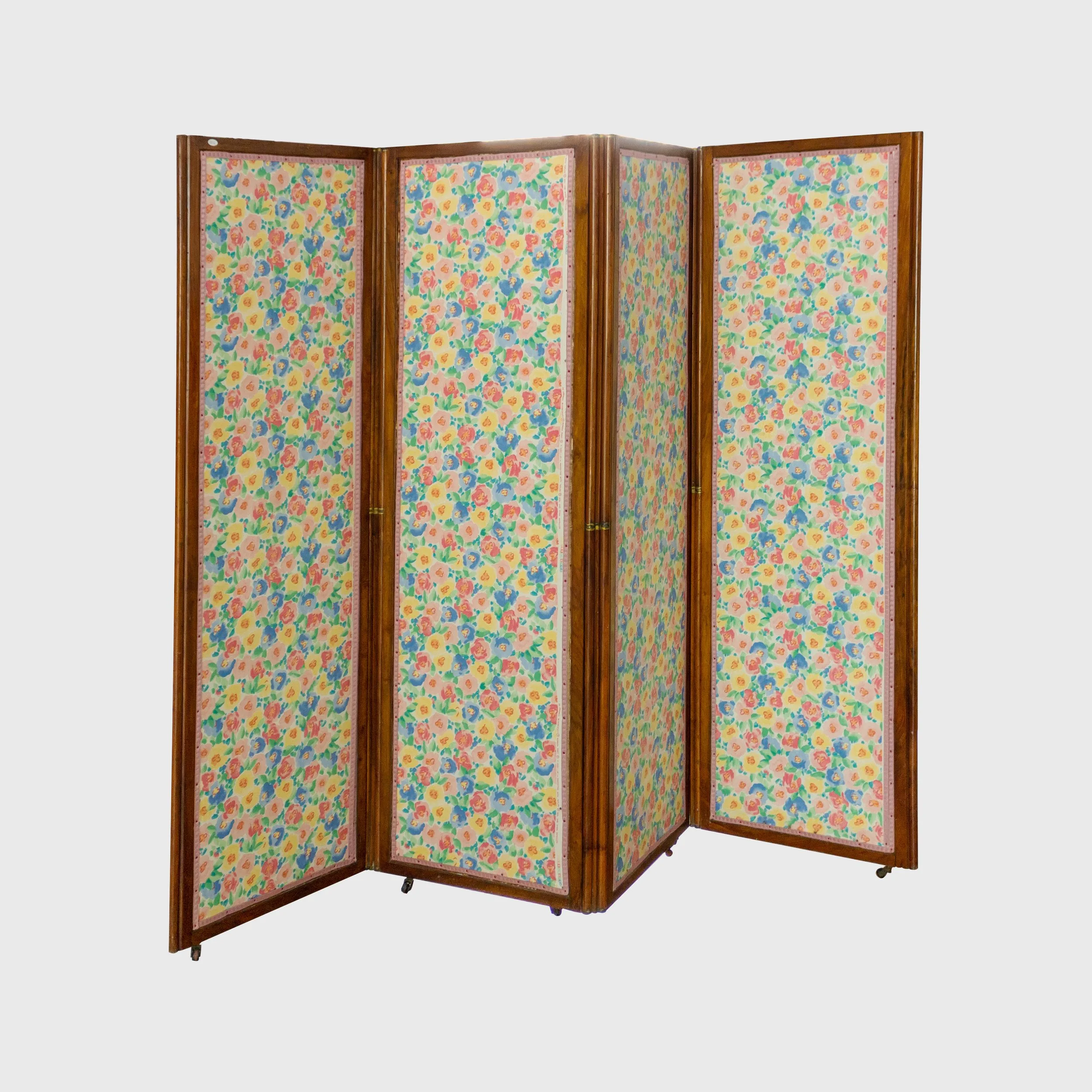 Large draughty homes and often large families meant that screens (or folding room dividers) were an ever-present feature in the Victorian household. This four-panel folding screen is finely made with polished oak frames, brass two-way hinges and castors. The fabric coverings are modern.