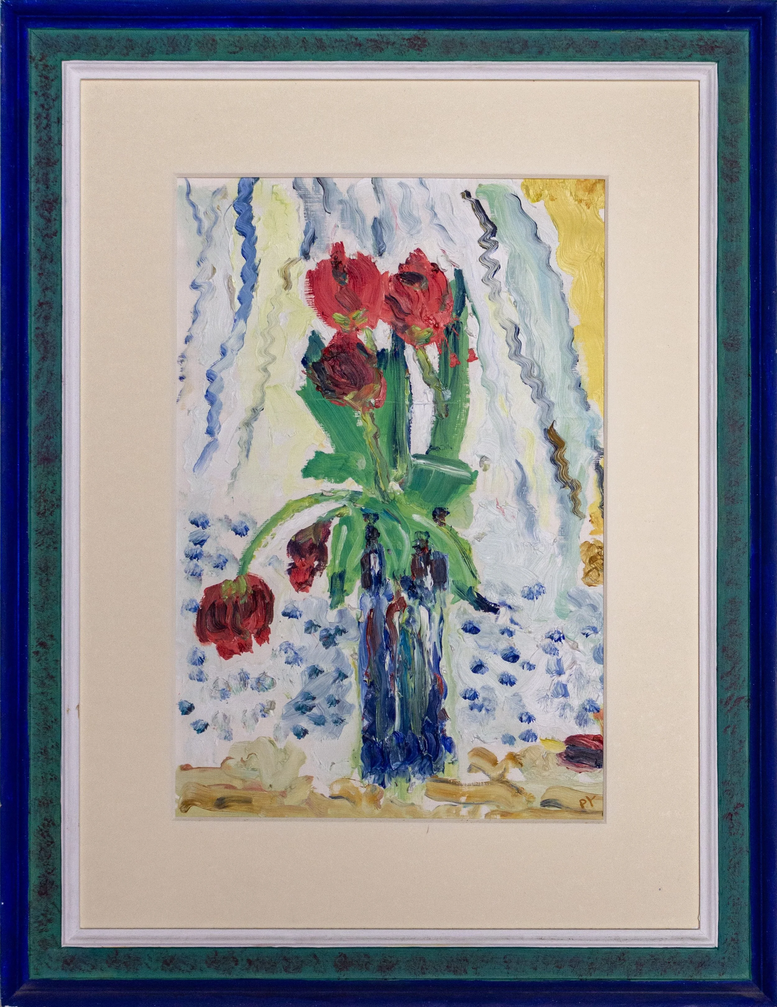 Catalogue number 96.04 ‘Red Tulips in a crystal vase’, oils on board, framed and initialed, 48 cm. high by 33 cm. wide. Bought from the artist in October 1996, following an exhibition at Patisserie Valerie in Brompton Road in London.