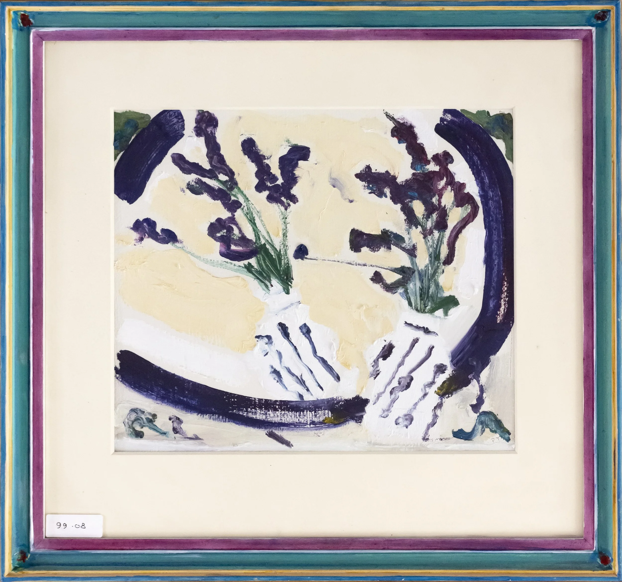 Catalogue number 99.08 ‘Lavender in crystal vase – reflected image’, oils on board, framed and initialed, 30 cm. high by 36 cm. wide. Bought from the artist in June 1999 at an exhibition organized by the Friends of Imperial College.