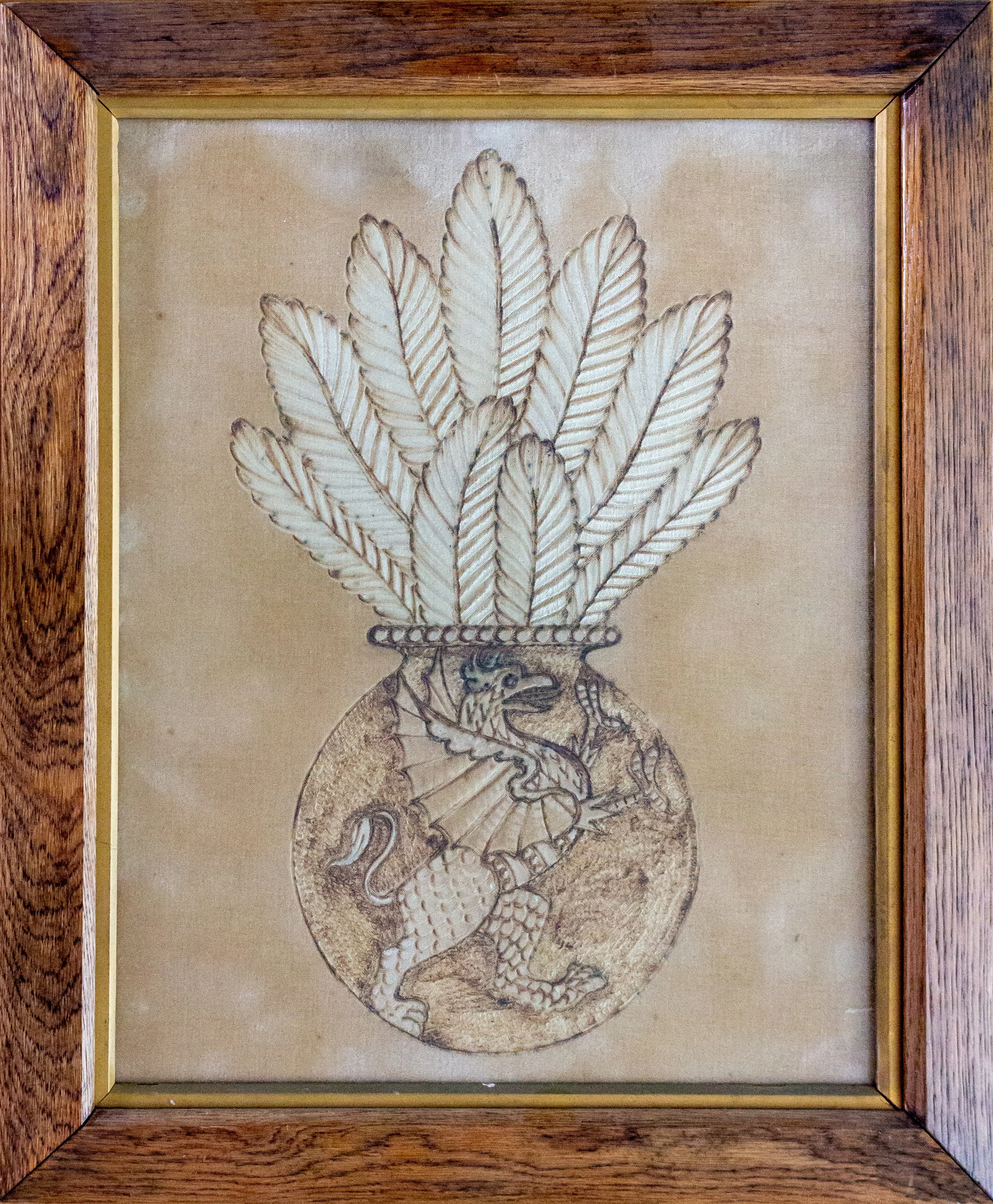 Una pintura de teoremas con acuarela sobre terciopelo, de autor desconocido, que data de finales del siglo XIX. Está sin firmar y enmarcada. Mide 41 cm de alto por 38 cm de ancho.