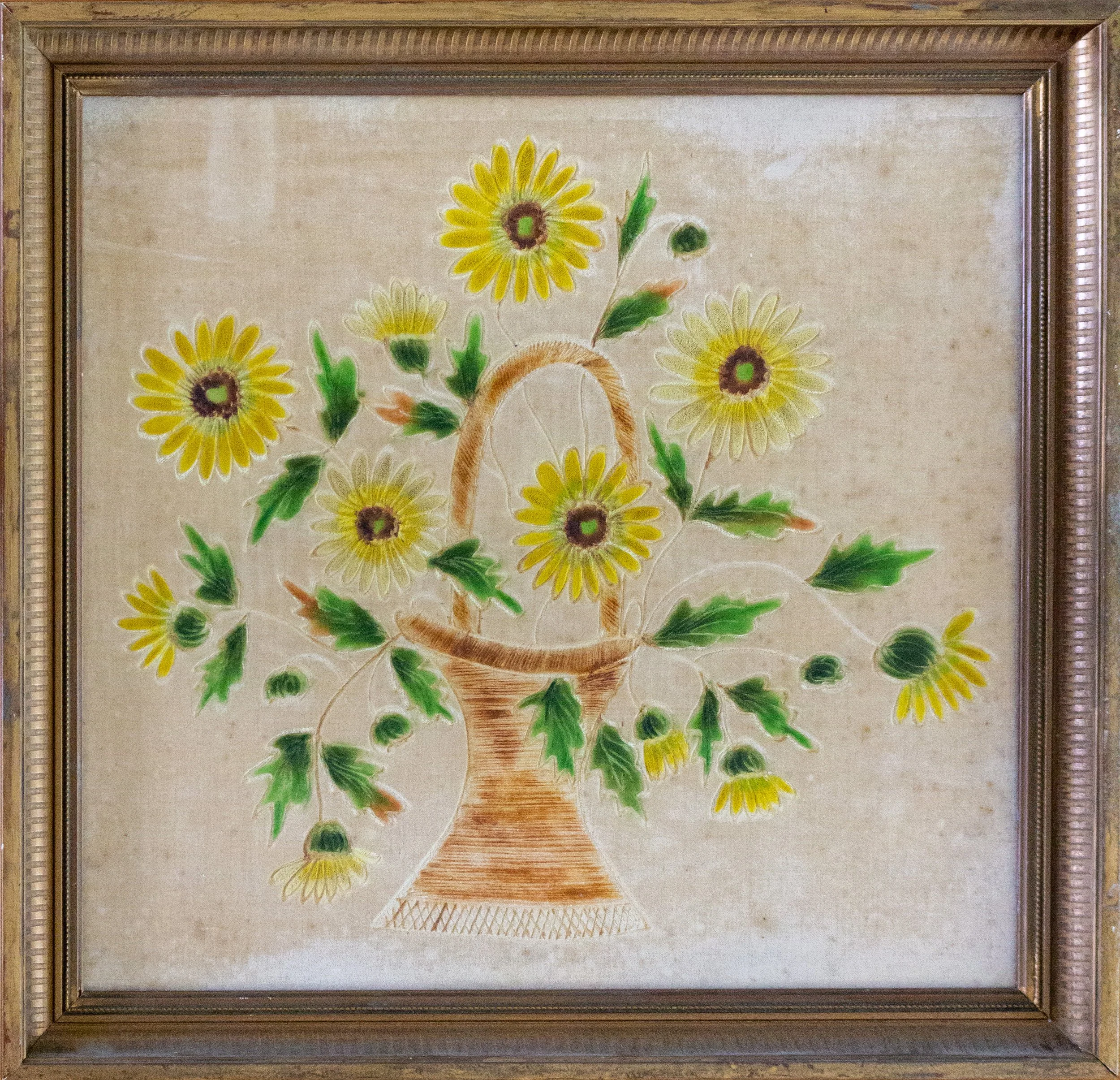 This is the second theorem painting bought from Julie Collino in November 2001. See also 01.07 - Feathers. They were often painted on velvet, which was much denser than today's velvet cloth, in order togive the painting a softness in appearance. Thick watercolors were used. Theorems were also done on paper, cotton, and other cloth. The final product was usually finished off with hand painting of details like grapevines, or stems. Is it a coincidence that Van Gogh painted his Sunflowers in the 1880’s?