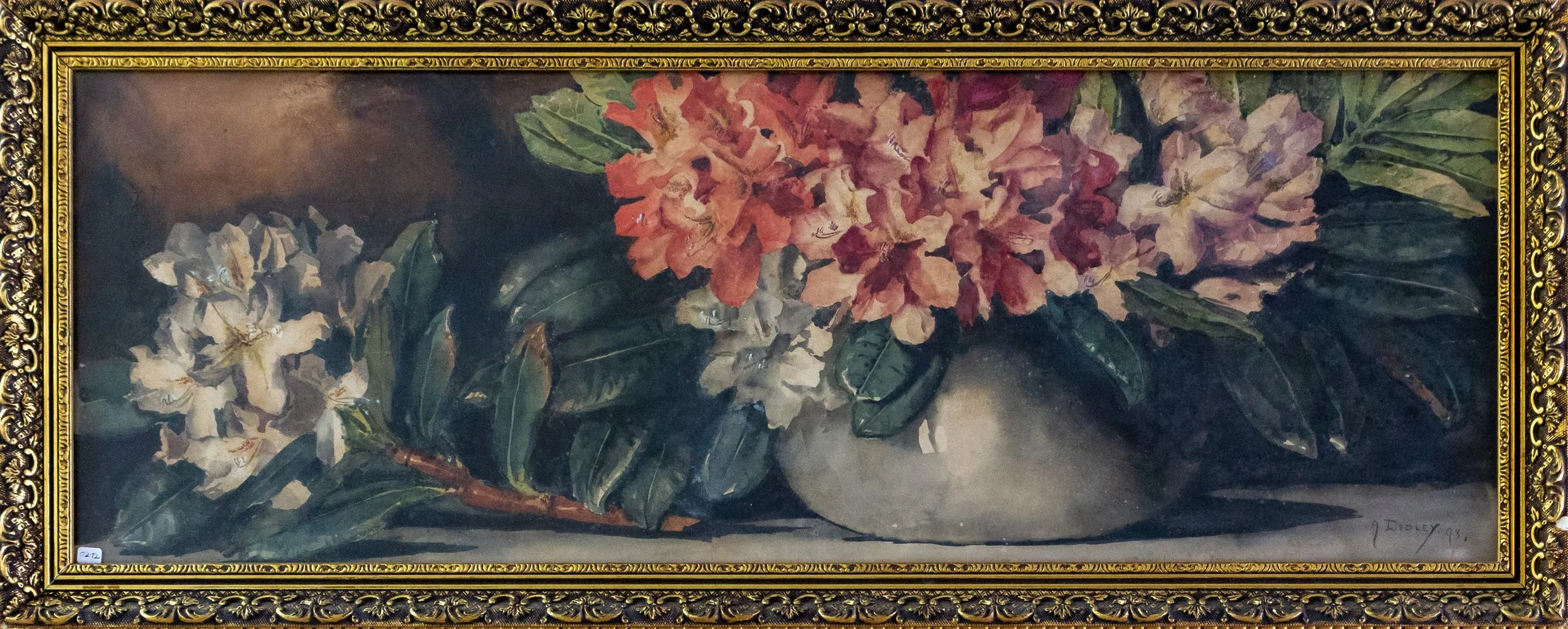 La aplicación de reconocimiento de plantas en mi teléfono identifica estas flores como lirios Canna. Arthur Dudley RBA fue un pintor afincado en Londres que utilizaba principalmente acuarelas, bodegones, frutas, flores y peces. También pintó bajo el seudónimo de Giovanni Barbaro. Fue miembro de la Royal Society of British Artists, donde expuso, así como en la Royal Academy y la Walker Art Gallery de Liverpool. Esta pintura proviene de Julie Collino en marzo de 2002.