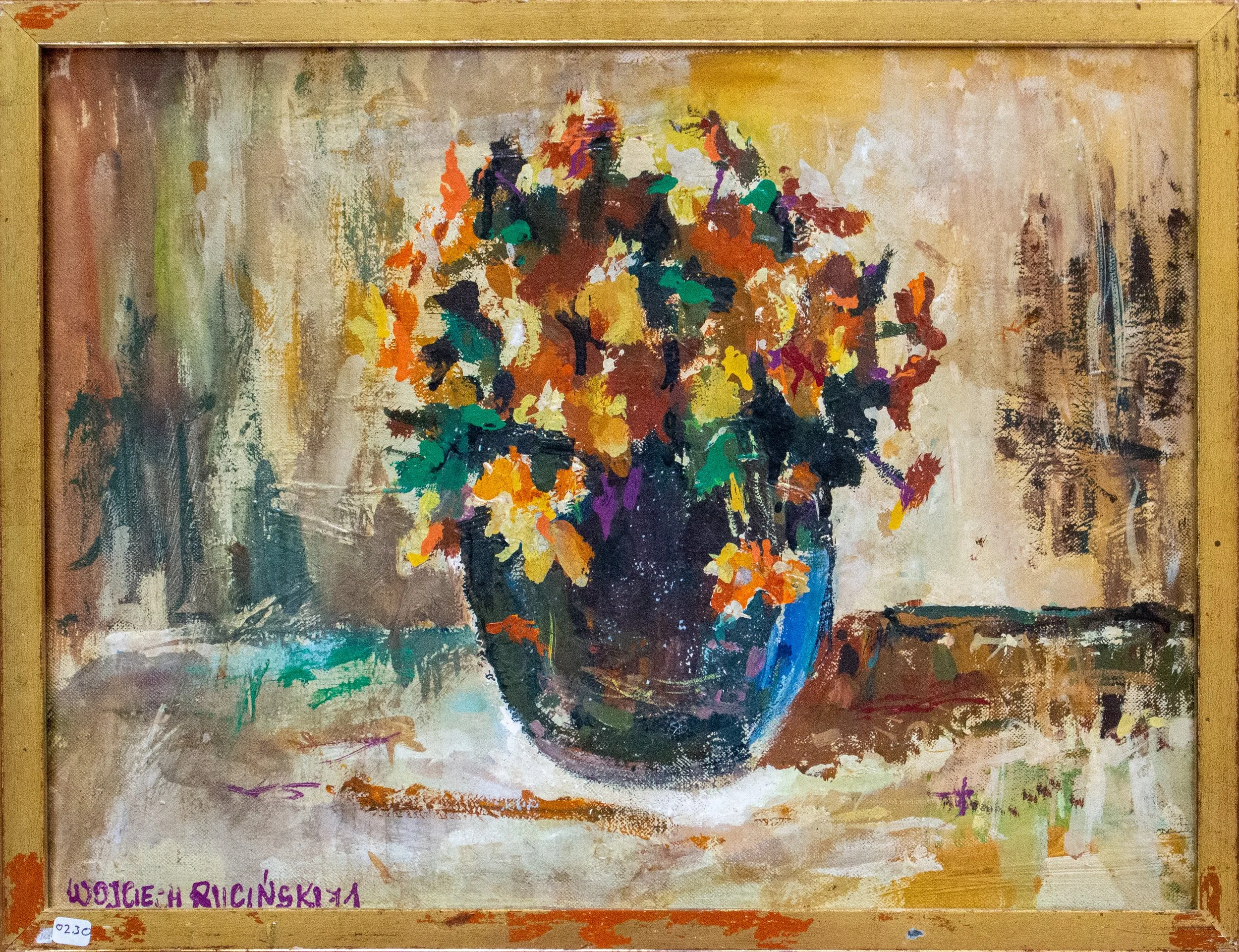 Una pequeña pintura al óleo sobre lienzo del artista polaco Wojciech Rucinski. Firmado y fechado, 1971. Está enmarcado y mide 20 cm de alto por 25 cm de ancho.