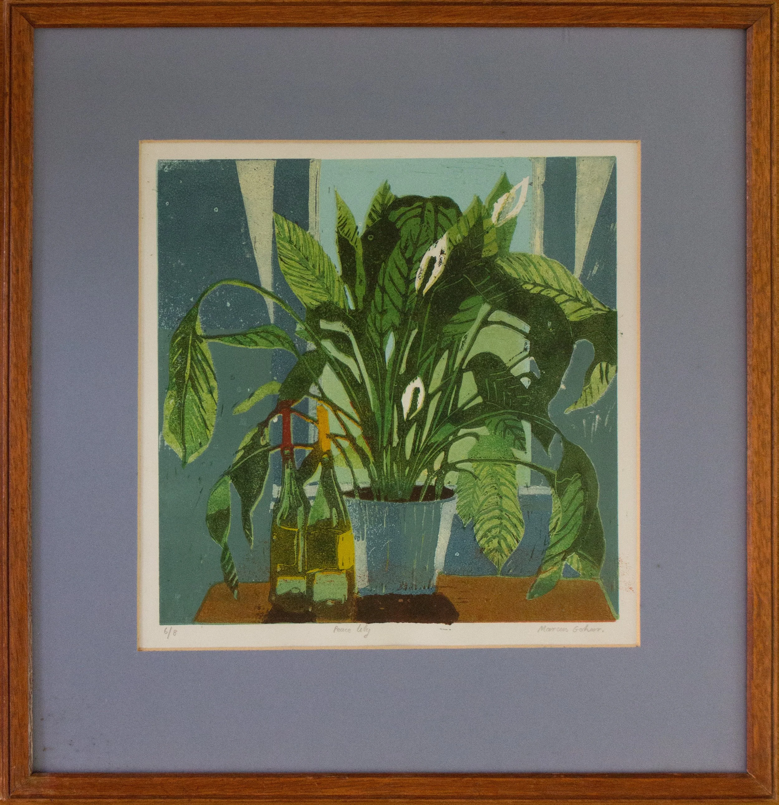 A linocut print using ink on paper by English artist Marcus Gohar (1960 - ) dating from the late twentieth century. Signed and framed. 30 cm high by 30 cm wide.