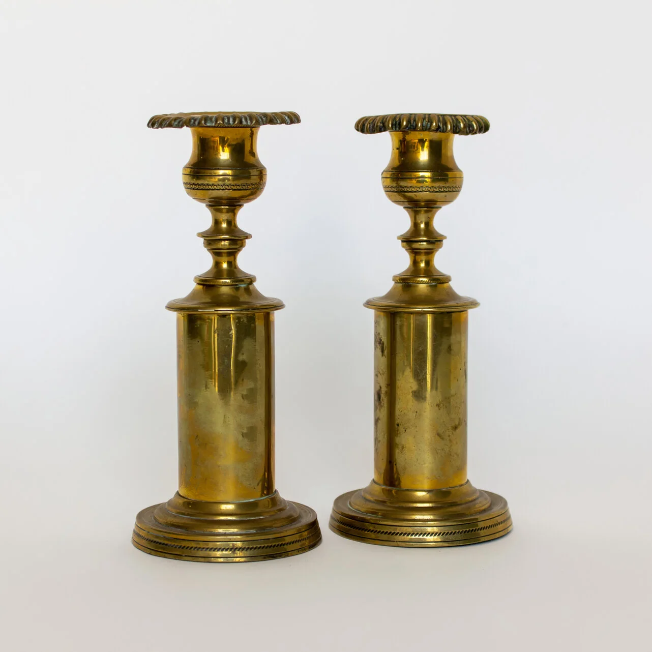 Un par de candelabros de latón de estilo Regencia de latón, de fabricante desconocido, datados hacia 1815. Alto 17 cm. diámetro 8 cm.