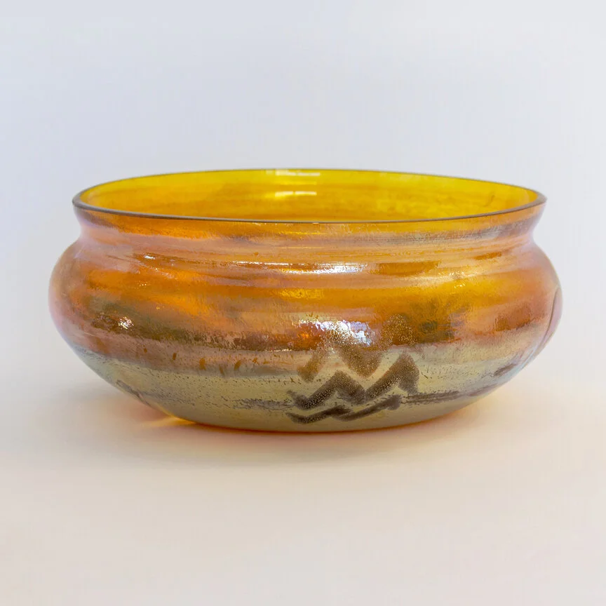 La Caithness Glass Company se fundó en 1961 en Caithness, Escocia, para producir a mano piezas de vidrio de calidad inspiradas en el arte. Ha tenido una historia comercial accidentada, pero ha sobrevivido y ahora tiene su sede en Crieff, en Perthshire. Es muy conocida por sus espectaculares pisapapeles de vidrio. Este cuenco hecho a mano es un ejemplo sorprendente de las habilidades del vidriero, con un diseño de remolinos incrustados en el vidrio tintado y un fondo plateado. Fue comprado en el Warwick Antiques Center en Jury Street, Warwick, en julio de 2011.