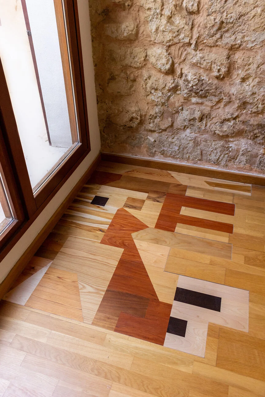 Durante la remodelación de la casa en la C/ Isabel II nº 15, uno de los errores que cometí fue el de elegir (por motivos de costo) un piso de madera laminada para el primer y segundo piso, en lugar de madera maciza. Ha habido varios casos de la superficie superior enchapada de roble que se separa de la base, causada por la entrada de agua de lluvia. Un área en el extremo sur del primer piso sufrió daños particularmente graves e irreparables en 2018 debido a un sello defectuoso en la puerta de la pequeña terraza. De la adversidad surge la oportunidad, y al restaurar la sección de piso dañado, encargué a Guillermo Linares que diseñara un reemplazo de madera maciza, que luego fue fabricado e instalado por su empresa Carpintería Gavila. Lo tituló "El rompecabezas". Hecho de siete maderas diferentes, finalmente fue pulido y sellado en febrero de 2019.