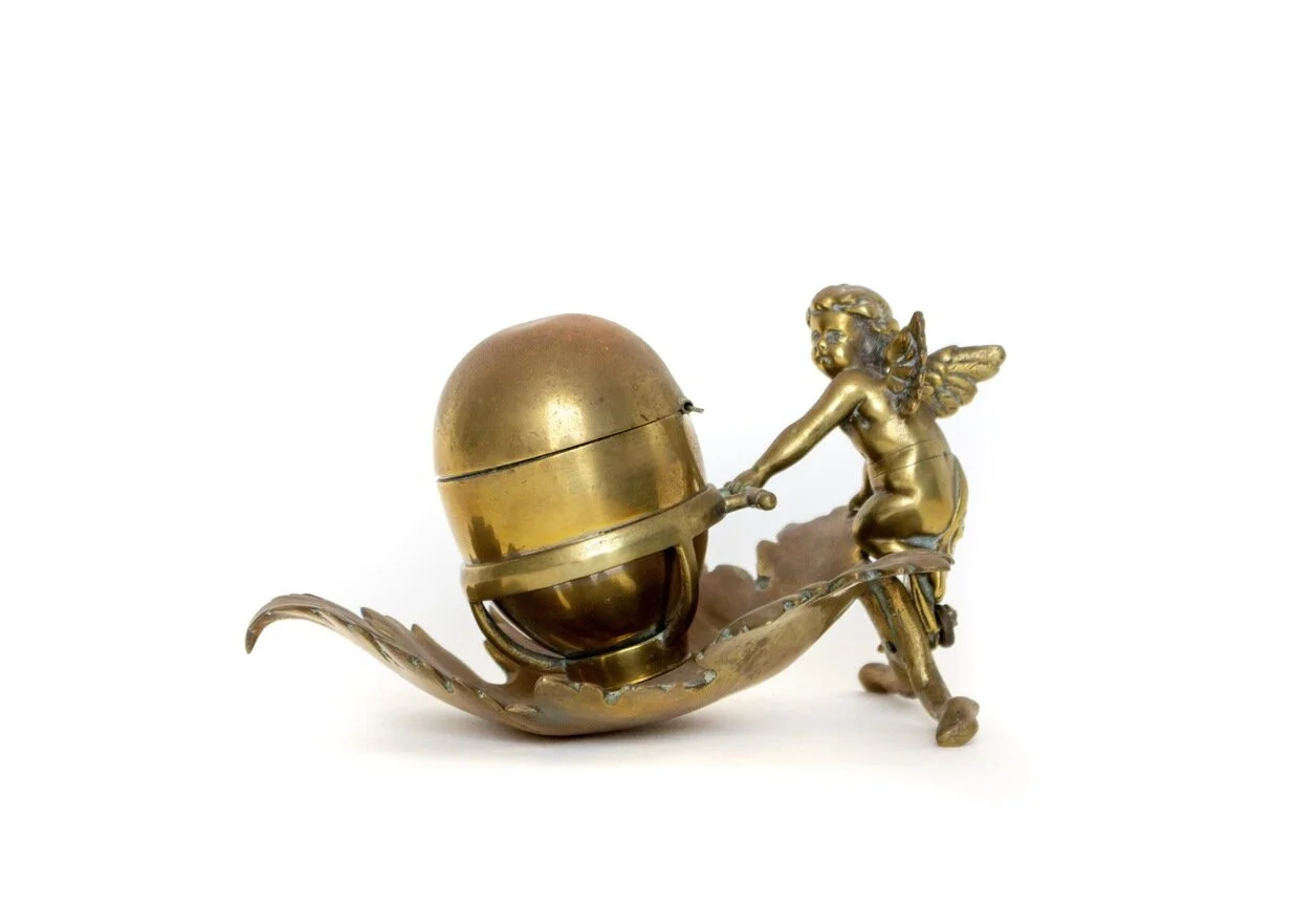 This brass inkwell, showing Cupid on a giant lily-pad, is an example of a Victorian mass-produced utilitarian/decorative object which, in one form or another, would have been found in most houses at that time.