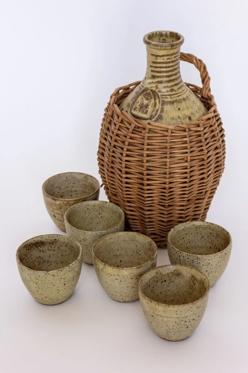 Jane's brother was a schoolteacher in Somerset, and whilst staying with him in 1970, they visited the pottery at Muchelney and she bought this wicker-encased Pitcher and set of 6 cups directly from John Leach.