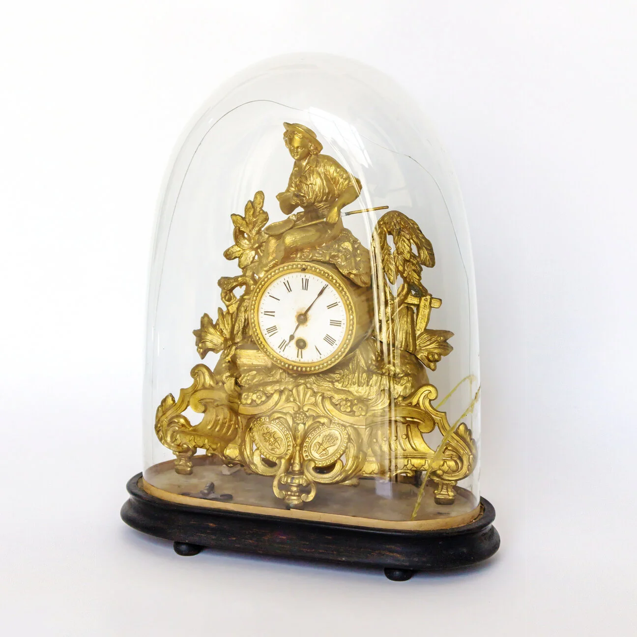 The case is orate, folate, and features a sailor boy holding a butterfly net - symbols of youth and sunshine. The clock is on a stand under a glass dome, which is damaged. Jane and I were married in August 1973, and this was her wedding present to me. I do not know where she got it from.