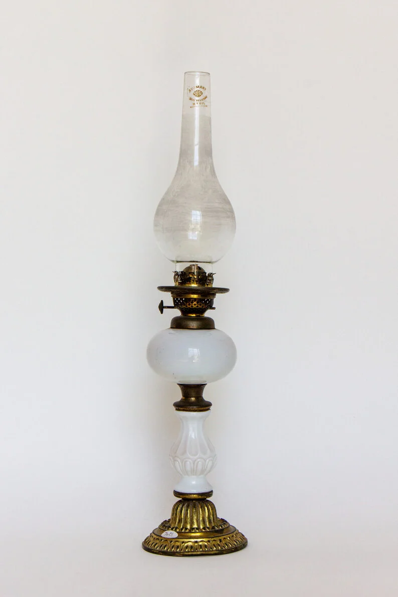 This plain example made from brass and white ceramic, with a tall glass flute was bought from the Warwick Antique Centre in 1974. It works perfectly and gives off a very pleasant warm light.