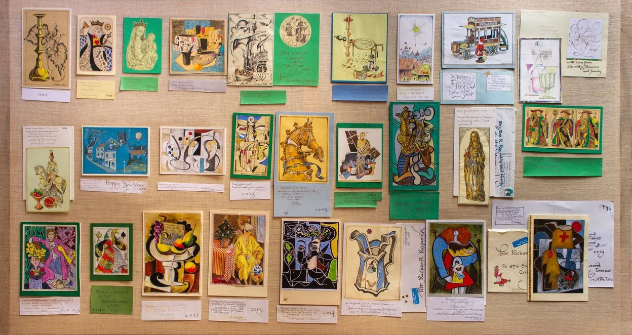 “Estas tarjetas, que celebran la Navidad y el Año Nuevo, nos fueron enviadas a Jane y a mí por sus tíos, Frances y Edward Campden. Pintadas a mano por Edward en varios estilos, muestran sus asombrosas habilidades y un travieso sentido del humor. La foto le muestra trabajando en la tarjeta de 2017. Por supuesto, parte del placer tanto para el emisor como para el receptor de estas tarjetas es la prueba de su conocimiento de la historia del arte al identificar (donde no está directamente indicado) a quién o qué estaba imitando.