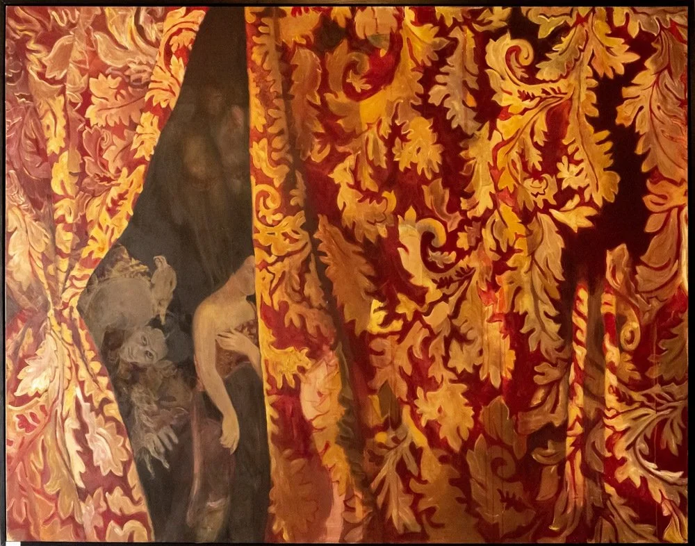 Esta es una de las tres grandes obras de Jane Ward que presentó a la muestra de graduación cuando se graduó en el Ruskin College Oxford en julio de 2001. Las otras dos son 01.17 Hell y 01.18 A Heavenly Scene. Compramos las tres directamente a la artista en la muestra. Ella escribió en ese momento: “La Cortina” es la que me llevó más tiempo ejecutar y la que más problemas me dio. Este cuadro está influenciado por la idea barroca del teatro, y lo veo como algo relacionado con la memoria y con el futuro. Me recuerda el funcionamiento de la mente, de cómo la memoria puede entrar caminando espontáneamente perturbando el presente, y también cuánto de la vida queda por descubrir, escondido de nosotros por una cortina, pero que surge en un momento inesperado como un actor esperando su señal.”