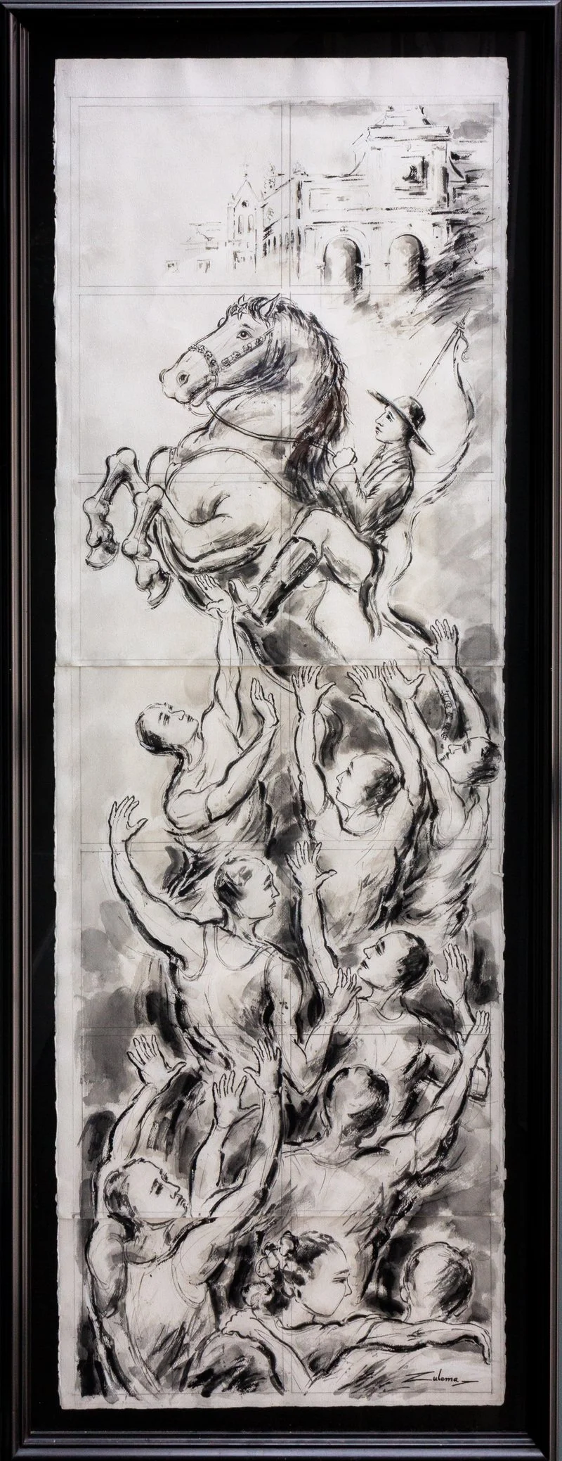 Este es el diseño del gran ventanal de la Fundación (820 cm de alto por 284 cm de ancho) creado por Zulema en el taller barcelonés del maestro vidriero Jordi Vidal e instalado por Toni Vidal, de Ciutadella, y su equipo de la cristalería “De vidre”, en 2014. Véase también la entrada de catálogo número 14.01. En ese momento Zulema me escribió estas palabras: "Puedes ver en mi dibujo a la gente en el 'jaleo'. Siempre hay mucha gente, hombres y mujeres, alegres y felices. Los caballos saltan entre la gente, hay mucho movimiento y mucha emoción. Más abajo, en la imagen, se puede ver a dos personas abrazándose. La gente se siente feliz y comparte la experiencia, comparte nuestra felicidad. Las personas expresan su pasión, levantan los brazos y las manos hacia el caballo, y tratan de tocarlo, de recibir su calor, su energía, su fuerza. Todo es belleza y vida. En el cuadro hay un movimiento que sube hacia el caballo, el elemento más importante, simbólico de Menorca y de la fiesta, el espíritu, con un movimiento ascendente”.