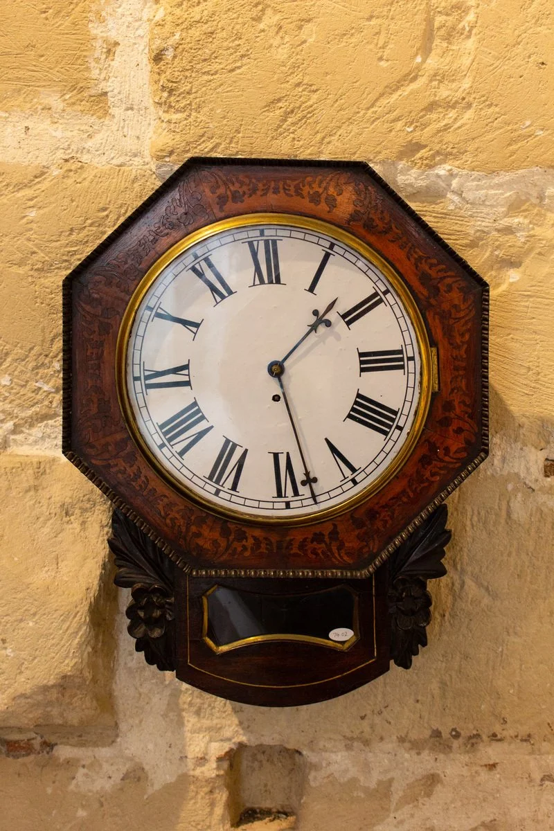 Reloj de pared, de principios del siglo XIX y de fabricante desconocido. Mide 43 cm de ancho por 48 cm de alto y 13 cm de fondo. La esfera del reloj tiene 29 cm de diámetro. No de catálogo 74.02