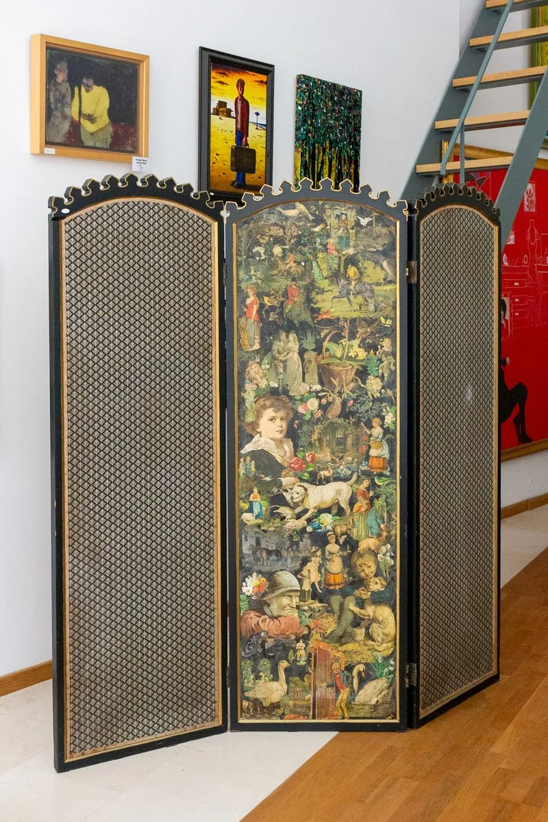 Inglés, fabricante desconocido. Finales del siglo XIX. Tres paneles que miden 188 cm de alto por 61 cm de ancho. Los separadores de habitaciones (o mamparas) se utilizaban con frecuencia a finales del siglo XIX como extensiones de los álbumes de recortes familiares que los Victorianos mantenían inveteradamente. Así, fotografías de personas, animales, flores, etc. se recortaban de las revistas y se pegaban a las amplias superficies, a menudo cubiertas de tela, que proporcionaban las pantallas, y luego se barnizaban. Este estilo de decoración posteriormente se conoció como decoupage. Esta pantalla de 3 elementos, una pieza icónica de mobiliario Victoriano inglés, igual que la anterior (ver n2 de catálogo 78.02), se compró en Lillee Road, Londres. Tiene un marco de madera pintado en negro con reflejos dorados y un marco superior con forma de almenas. Ciertamente tres, y probablemente todos los seis paneles, habrían sido decorados con recortes, pero solo uno los conserva, ya que los otros fueron reemplazados por telas modernas.