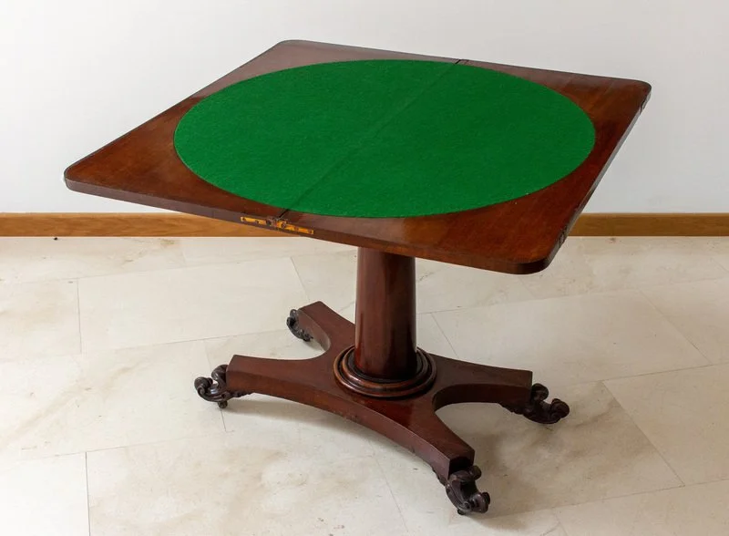 Esta mesa tiene una parte superior de caoba de llamas finas que se levanta y gira para revelar la superficie de juego del tapete verde circular. Tiene un friso de formas elegantes apoyado por un pedestal torneado con un collar que termina en una plataforma de cuatro hojas con patas talladas y con las ruedas ocultas originales. La obtuvimos del anticuario Percy F. Wale Ltd. de Regent Street, Leamington Spa, para decorar nuestra casa recién adquirida en Castle Hill House, Warwick, en 1987. Me trae dos recuerdos. Uno es de mi padre quien, desde antes de que yo naciera y hasta que murió 40 años más tarde, cada jueves por la noche jugaba al bridge con los mismos tres amigos en una mesa entre una niebla de humo de tabaco. Yo nunca he fumado. El otro es jugar al Scrabble en esta mesa con la ferozmente competitiva Robyn, que luego se convertiría en mi nuera, cuando nos visitó por primera vez en Warwick. Nacida en Australia, quiso jugar y anotó 33 puntos con la palabra UGG, de triple puntuación, un tipo de bota de las Antipodas, aparentemente.