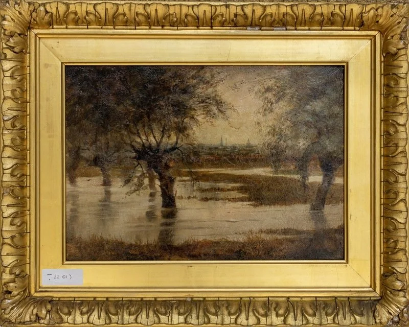 A well-executed English landscape oil painting, showing the River Cherwell in flood, with the ‘dreaming spires’ of the City of Oxford in the far background on a wet and misty early autumn (the leaves are still on the trees) day.It is not signed, but the name F. Bailey is written on the back. We regularly drove between London and Warwick at that time using the A40 road to Oxford (before the M40 Motorway was built) and this is the winter-time view that you often got from the road as it skirted the north of the city. The picture, in its gilt frame, was bought from Warwick Antiques (16-18 High Street) in April 1988.
