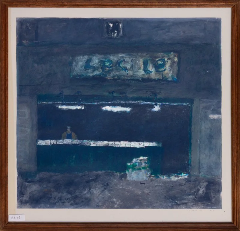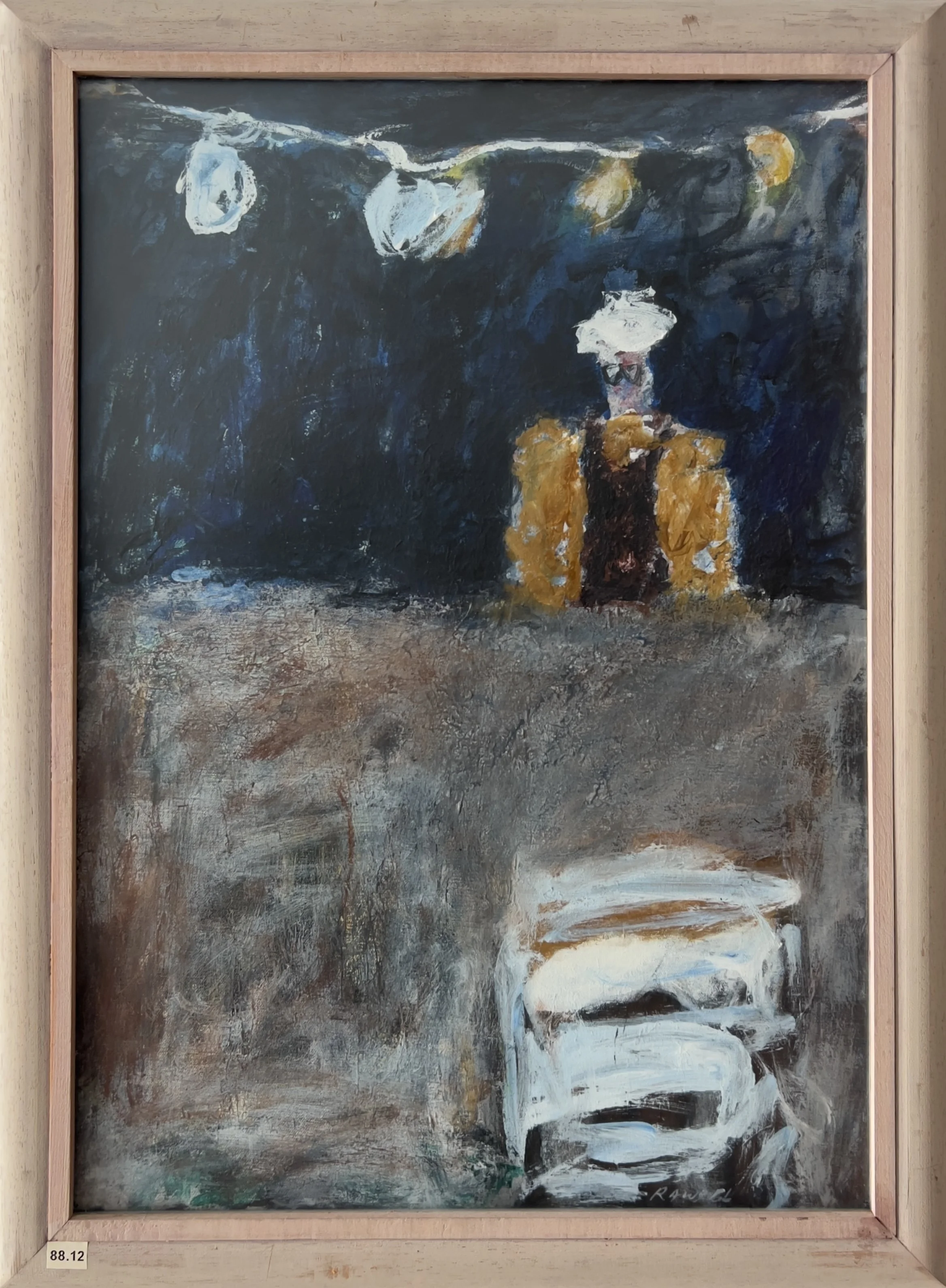 The first two of these three paintings were bought in late May 1988 from the artist at his degree show at the Royal College of Art in London. ‘Night Shift’ was bought in November of the same year from the Oxford Gallery, 21, High Street ,Oxford. Richard Webb was born in 1963 and attended the Camberwell School of Art and Craft from 1982 to1985 where he gained his BA degree. He then went on to study for his Master’s degree at the Royal College, which he obtained in 1988. For a while after buying these pictures, we remained in touch with him and he came to stay with us at the seaside in Essex in 1990, where, he subsequently told us, the sea and the sand gave him the inspiration for one of his later works – ‘Triple Echo’ depicting three seagulls and a little girl on an expanse of beach. He regularly exhibits in London, particularly at the Cadogan Contemporary Gallery in Chelsea.
