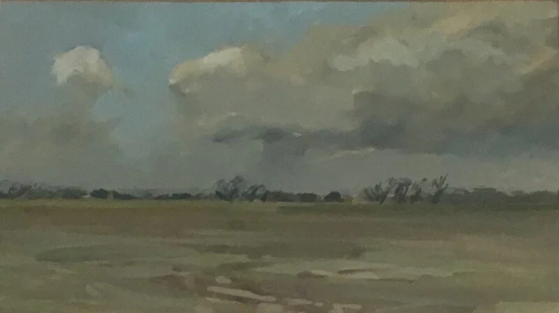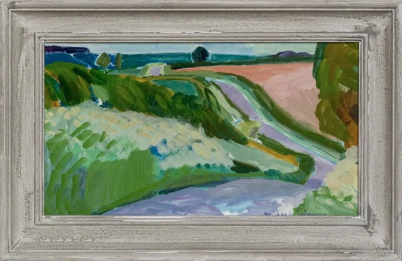 91.02 "Campo de Warwickshire", 1991, 21 cm de alto por 39 cm de ancho. Ambos pintados en acrílico sobre tablero por Michael Sofroniou (n. 1957).