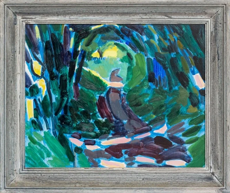 Supongo que todos los que pasan el tiempo explorando galerías o tiendas de antigüedades o ferias de arte lo hacen en parte con la esperanza de que algún día se topen con una obra maestra no descubierta o una obra "perdida" de un artista famoso. Y así fue con esta pequeña pintura que Jane encontró en Warwick Antiques, y que logró convencerse de que fue un estudio realizado por uno de los muchos pintores impresionistas que pasaron un tiempo en Bretaña a finales del siglo XIX. Su investigación la llevó a Eugène Boudin y su estancia en Etretat, pero no tengo pruebas ni documentación sobre cómo hizo esta deducción. La casa en el acantilado debería ser identificable, habría pensado. El enmarcado está dañado y tiene una extensa infestación de lombrices de la madera muertas.