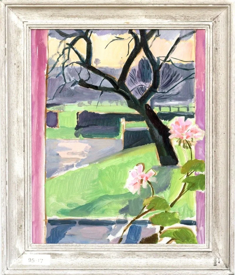 Otro ejemplo de las habilidades paisajísticas de Michael Sofroniou (ver también 91.02 y 93.07). Compramos esta pintura en la "Exposición de primavera" de John Davies en su Church Street Gallery, en Stow-in-the-Wold, Gloucestershire, en marzo de 1995. En ese momento, Michael y su familia vivían en una cabaña en un pequeño pueblo llamado Tysoe, y esta escena evocadora es de su jardín desde la ventana de un dormitorio.