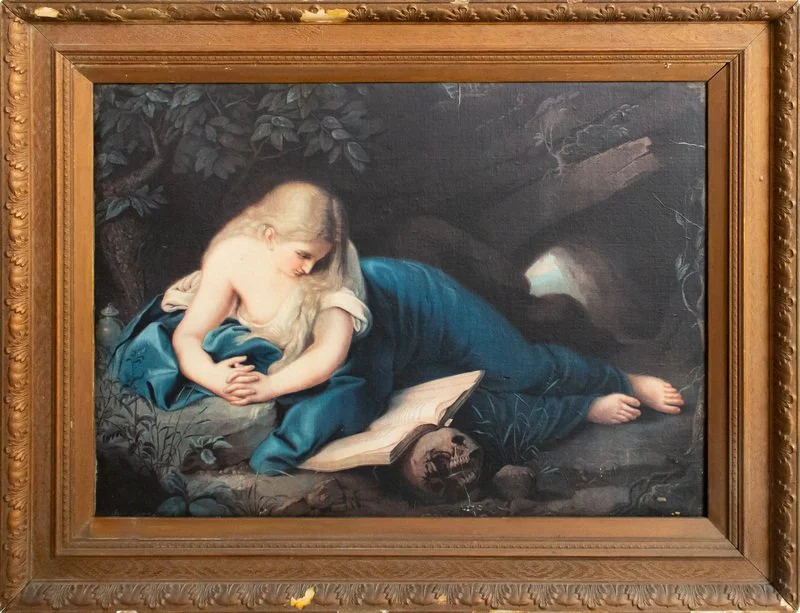 Esta es una copia de una pintura de Giuseppe Mazzoline (1806-1876) titulada "Mujer leyendo un libro descansando sobre una calavera" fechada en 1870, que muestra a María Magdalena reclinada en el desierto. La obra de Mazzoline, a su vez, es una copia de un gran óleo (121 cm de alto por 188 cm de ancho) titulado 'La penitente María Magdalena' del artista italiano Pompeo Batoni (1708-1787) pintado en 1745 que colgaba en el Museo Staatsliche en Dresde. Fue destruida en el bombardeo de la ciudad de Dresde en 1944. La penitencia de María Magdalena es un tema recurrente en el arte italiano desde el Renacimiento hasta el siglo XIX (Tiziano, Caravaggio, Donatello y muchos otros), cuya popularidad se atestiguadas por las numerosas copias y grabados para uso doméstico que se conocen. Compramos esta imagen en Warwick Gallery en 14, Smith Street, Warwick en junio de 1997.